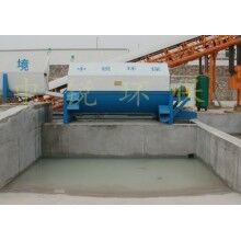 該系統(tǒng)主要由:攪拌車加水清洗裝置,溜槽輸送裝置,砂石漿水分離裝置,和泥漿水后處理裝置組成?;炷凛斔驮O備清洗后,將殘余混凝土排入溜槽中,在高壓水流沖擊下,經(jīng)溜槽進入砂石分離機,在不斷旋轉(zhuǎn)的分離機作用下,對混凝土進行充分的清洗,同時將砂、石進行分離,分離后的砂、石在導料葉片的作用下背向流動,再通過提升式出料口排出分離機,分別堆放。清洗后的漿水從分離機的底部排出進入沉淀池逐級沉淀后循環(huán)使用或進入攪拌池回收利用。進入攪拌池(一般情況2個攪拌池)的漿水為了防止沉淀凝固,需通過攪拌器的作用,攪拌器的工作為間歇式。分離出水泥漿在連續(xù)的攪拌器作用下,再通過高壓污水泵輸送到攪拌樓中待生產(chǎn)計量再利用。整個控制系統(tǒng)設有手動和自動控制,方便控制設置,整個系統(tǒng)運行可靠,故障率低,維護量少等特點。